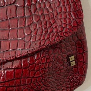 Helen Welsh bag with gold like metal initials on front of purse . Purse is a beautiful burgundy with a sassy print inside liner. Purse has a magnetic close and a zipper inside and zippered pocket on back of purse. Has a alligator type feel.