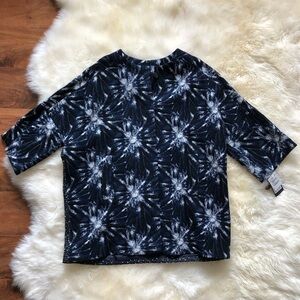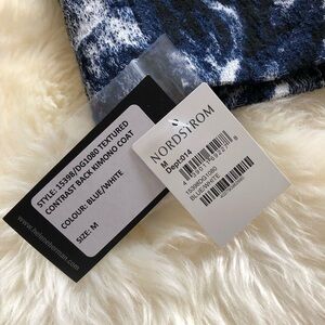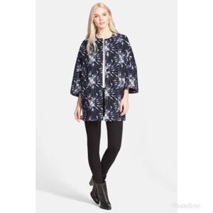 Blue and white. Stunning abstract design. Hidden button placket. Front pockets. Fully lined. Front and sleeve - Viscose, poly, wool, acrylic and elastane. Back - poly, cotton, acrylic. Oversized fit.