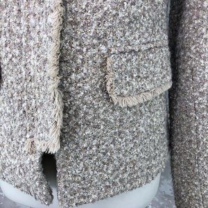 NEW Helene Berman taupe faux fur collar (detachable) zip front metallic tweed jacket is NWT. Bouclé tweed jacket with fringe trim on pockets on placket.