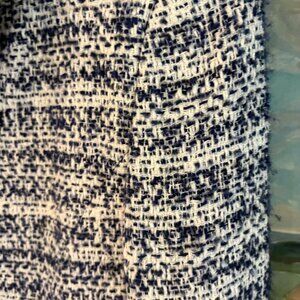 New with tags, this Helene Berman London blazer is a timeless wardrobe staple crafted in a navy and white tweed bouclé weave. Featuring a chic double-breasted silhouette, notched lapels trimmed in ivory, and silver-tone buttons, it’s a versatile piece that can be styled with denim for casual chic or tailored trousers for polished sophistication. Made in England and originally sold at Nordstrom for $225.