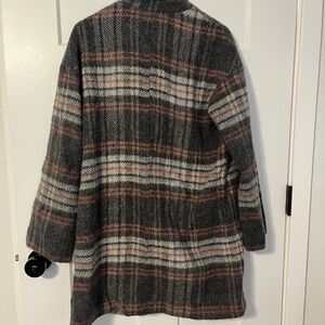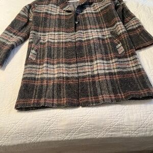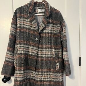 Helene Berman London Plaid Wool Blend Long Coat Size Large Gray Coral White