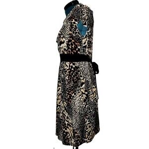 Helene Blake Womens Size Large Leopard Safari Print Short Sleeve Ruffle V Neck High Waist Tie Back Pull On A Line Supple Comfy Boho Artsy Dress.