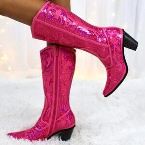 These Helen's Heart tall sequin cowboy boots in hot pink fuchsia are a stylish statement for any western-themed occasion. With a pointed toe, mid-calf shaft, and high block heel, these boots offer both fashion and comfort. The boots feature a zip closure and medium calf width, making them perfect for parties or casual wear. The sequin accents add a touch of glamour to these unique and bold boots, which are sure to make a statement with their western-inspired design.
