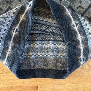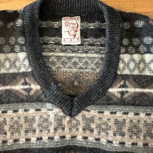 Helifax Bay Made in Italy Wool Blend Sweater. Tones of charcoal gray, gray,, tan, and cream. Pullover, v-neck. Ribbed at the neck, bottom hem, and cuffs. Geometric patterns in various designs including Chevron, diamonds, ovals, lines. Quality sweater. I could not find the brand when I searched for it. Interior side tag says it was made in Italy. 80% wool, 20% nylon. Excellent pre-owned condition. No holes or stains. Clean. Some pilling, but overall minimal. Might be more pilling on the interior than exterior. No size, please see approximate measurements for sizing. I think it would fit a large, but I'm not 100% sure of that.