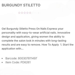 These press-on nails feature a stunning burgandy hue, offering a glossy finish that mimics a professional gel manicure. Designed for easy application, they provide a quick and stylish solution for a salon-quality look at home.