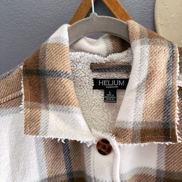 Upgrade your wardrobe with the Helium London L Shacket Jacket, a perfect blend of style and comfort. This versatile plaid jacket features a trendy "shacket" design, combining the ease of a shirt with the warmth of a jacket. The cozy sherpa-lined interior ensures you stay snug and comfortable during chilly days, while the classic plaid print adds a timeless touch to your outfits. Whether you're layering it over a casual tee or pairing it with your favorite winter accessories, this shacket is a must-have for effortless yet stylish looks. Gently pre-loved and in great condition, this piece is perfect for elevating your cold-weather wardrobe. Don’t miss the chance to make it yours!
