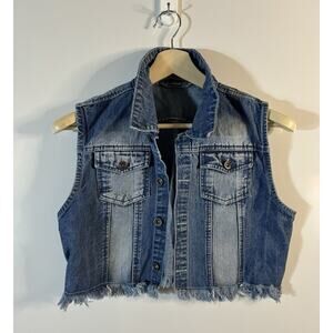 Helium London Womens Jean Vest Boho Grunge Crop Wash Y2K Raw Hem Sz L