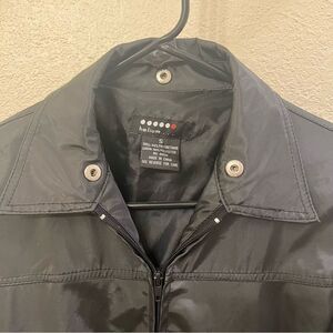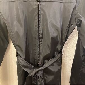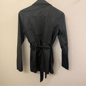 This belted black jacket is from Helium. The item has long sleeves and a zipper front. The jacket shell is made from 100% polyester. The lining is out of 100% polyester. The size is small. The measurements are 26” L x 18” W (pit to pit) x 23” sleeve (shoulder to cuff). This jacket has been gently worn but it is in very good condition.