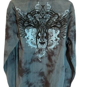 NWT The Helix Long Sleeve Button Up Men's Blue Velvet Graphics Shirt in size M is a stylish and versatile addition to any man's wardrobe. Made from cotton and featuring a collared neckline, button closure, and a regular fit, this shirt is perfect for casual occasions. The blue color and graphics give it a Western, motorcycle, rock, and cowboy theme, making it a standout piece. Machine washable for easy care, this shirt is suitable for all seasons and is sure to make a statement.