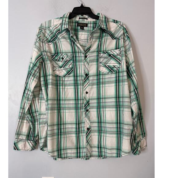 Elevate your casual style with this handsome Helix Plaid Button-Up Shirt! This shirt is in great pre-owned condition and ready for a new adventure.