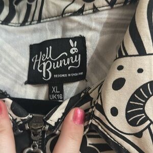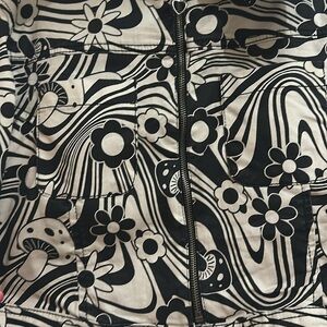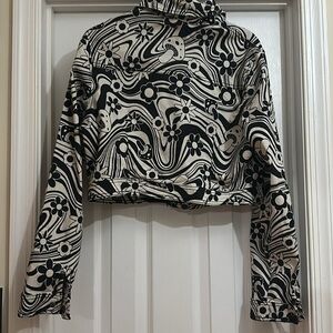 Stylish bomber jacket with bold black and white patterns. Features a zip front and long sleeves. Perfect for a chic, modern look.