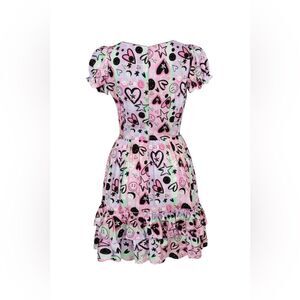 Part of Hell Bunny's collaboration with Smiley® Originals, The Robbie Dress! This cute mini dress is brought to life with lavender and pink tartan Smiley® artwork, intricately illustrated with black hearts and stars. The wide chestline is enhanced with black lace trim and a dainty black bow on the centre bust. Short puffed sleeves are gathered with elasticated cuffs for a sweet silhouette. The fitted bodice is shaped with princess seams to hug the body, whilst the skirt is gathered at the waist for extra volume. The hem is elaborated with two rows of frill details that give the skirt even more drama and movement. Bring some joy to your wardrobe with The Robbie Dress!