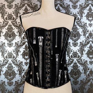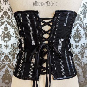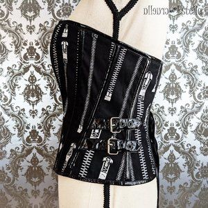Bold zipper corset top. Hook and eye closures in front. Lace up closure in back. Two side buckle adjustments on each side. Boned.