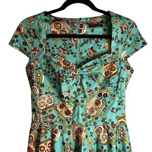 Hell Bunny Sugar Skull Sasha Dress Goth Emo Calavera Day of the Dead. Size and care tags removed. Approximate measurements 41.5” length 16” pit to pit 14” width at waist. These measurements compare to XS/S for brand. Listing as XS but please compare to something that fits you well. Great condition see photos for details. Sweetheart neckline. Brand lists as cotton elastane with hand wash.