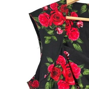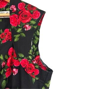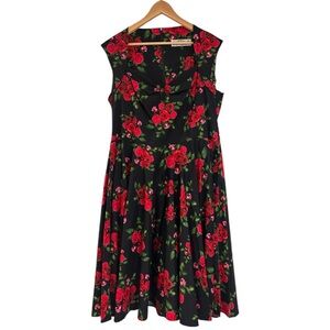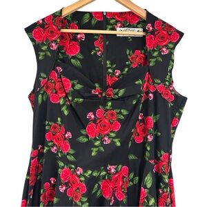 Beautiful vibrant red flower dress on a black background from Hell Bunny Vixen. Cotton swing dress. Bust is gathered into a tab to create a sweetheart effect. Zip in centre back seam. High neckline at the back.