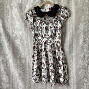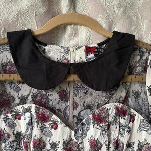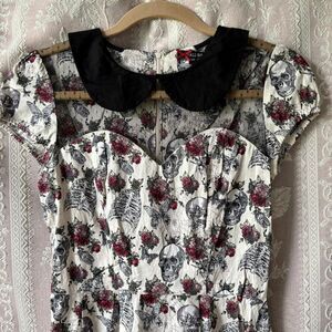 Cutest Hell Bunny dress cream with skeletons, roses, butterflies and spiderwebs. Black collar and mesh chest, cap sleeves and flare skirt. Zipper in back. Sold out. Really cool dress. Originally $50