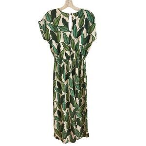 Cream / off white / ivory with green tropical leaves. V-neck. Button down. Short sleeves. Wide leg. Cropped. Elastic at waist. Keyhole in back with button closure.
