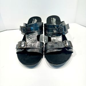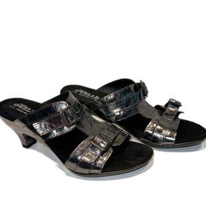 Chic t-strap dress sandal made from Italian leathers with croc embossing. Dual buckle can easily be adjusted for support and foot widths. Fully padded and flexible footbed for comfort and arch support. Non-skid rubber sole provides added grip and stability