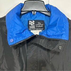 Good preloved condition Helley-Tech Helley-Hansen Men size Medium Waterproof Breathable Hiking Utility Packable Jacket. Adjustable drawstring, large front pockets, hideaway hood, and elastic cuff on sleeves. Slight wear on zipper and pin size hole on lower front jacket as seen in photo.