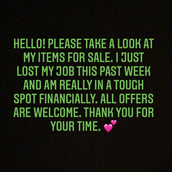 Hi all. I am open to all reasonable offers at the moment. I just lost my job recently and I am struggling to pay bills. Now my car needs major repairs as well. If you are unable to make a purchase due to a similar situation I will definitely keep you in my prayers. Much love to all. Thank you!