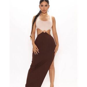 Keywords: Fashion Nova, maxi dress, cut-out, brown dress, party dress, cocktail dress, sleeveless, scoop neck, stretchy material, women's fashion, evening wear, pullover dress, elegant dress, long dress, new condition.