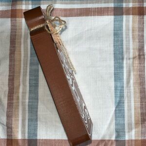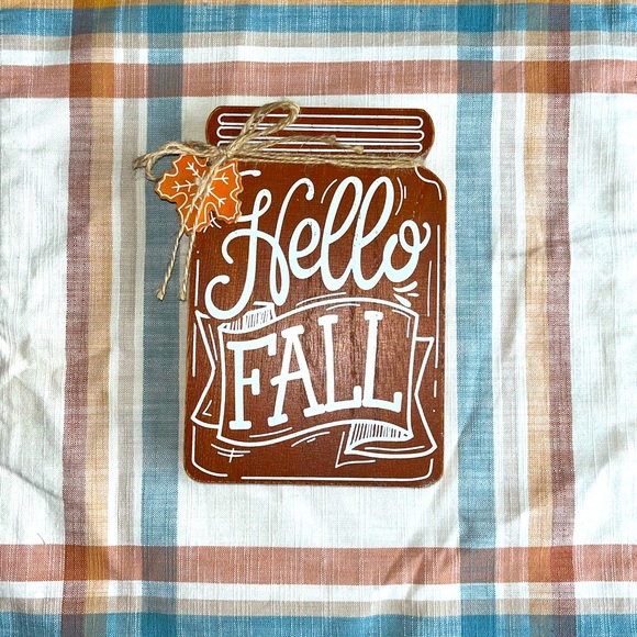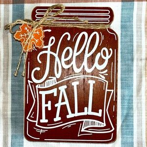 Wood “Hello Fall” sign in a mason glass jar shape with twine ribbon. Hook on the back to hang or it can stand alone.