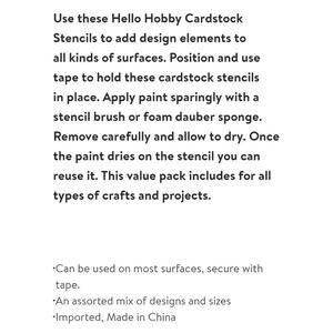Add a touch of modern charm to your crafting projects with this Hello Hobby cardstock stencils pack. The pack includes 8 sheets of stencils featuring abstract, geometric, floral shapes and sayings that are perfect for adding a unique touch to your designs.