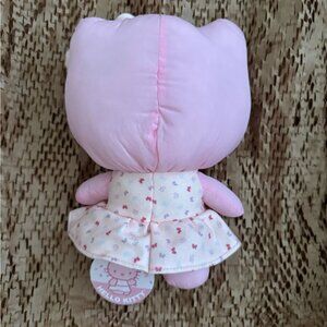 Charming Hello Kitty plush in light pink. Features a cream dress with tiny patterns. Ideal for hugs and play.