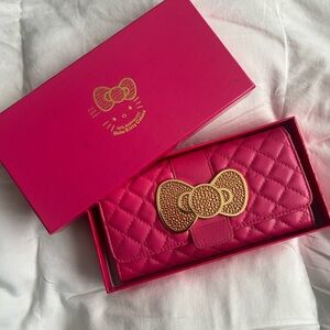 Vibrant fuchsia wallet with quilted design. Features iconic Hello Kitty gold bow detail. Stylish and functional.