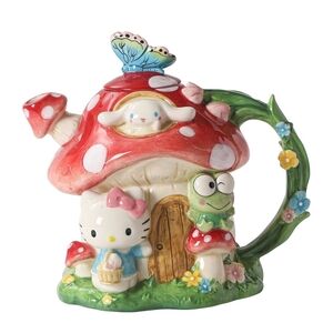 Charming teapot shaped like a mushroom house. Features cute characters and vibrant colors. Perfect for tea lovers and collectors.