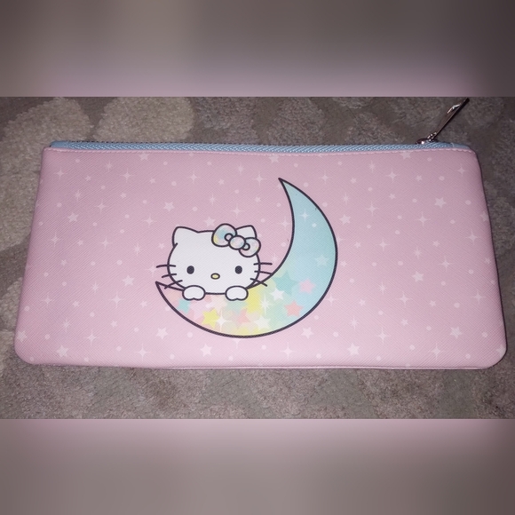 Charming Hello Kitty bag in soft pink. Features Hello Kitty on a pastel crescent moon. Ideal for storing small items.