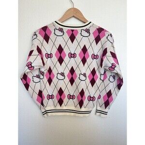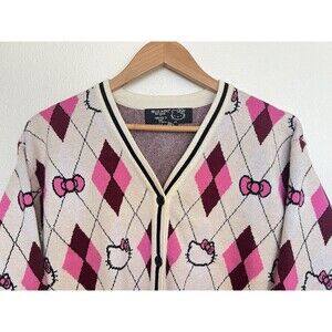 Hello Kitty Argyle Knit Cardigan Sweater Pink Burgundy Preppy Coquette Mall Y2K