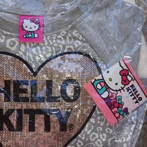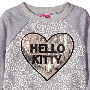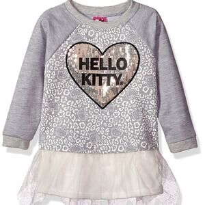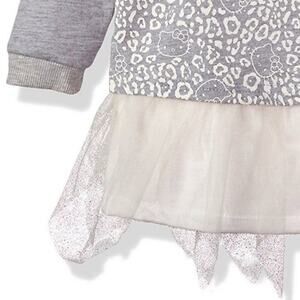 Sanrio HELLO KITTY toddler girls fall winter sequin heart applique, animal print front, raglan long sleeve terry sweatshirt dress with ivory mesh tutu hem detail. Cute worn with tights or leggings.