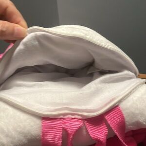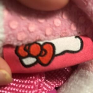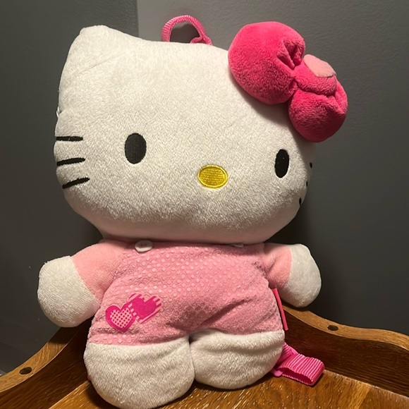 - Features a Hello Kitty plush with zippered compartment and pink adjustable straps to double as a backpack