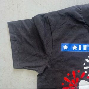 Charming Hello Kitty design on a black tee. Features red and blue fireworks. Perfect for playful style.