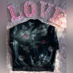 Chic Hello Kitty jacket in black. Adorned with red hearts and silver Hello Kitty designs. Perfect for a stylish look for women and teens 💕