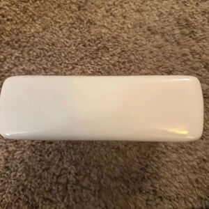 High quality 5x5 white ceramic box sign featuring Hello Kitty's face with a winky eye. Her bow is decorated with pink glitter. The 1 in. thick profile adds character and helps the sign stand straight on your desk or living space.