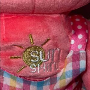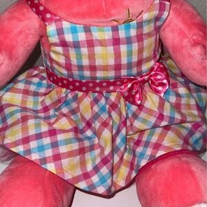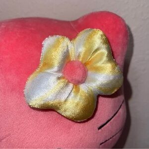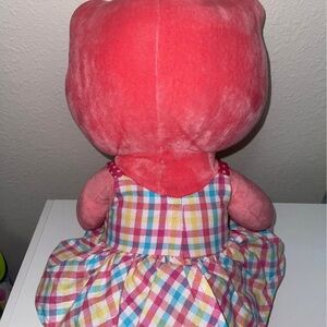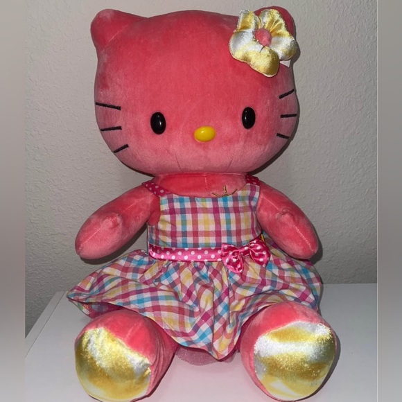 Charming Hello Kitty plush in a colorful checkered dress. Features pink body and yellow bow. Ideal for cuddles and playtime.