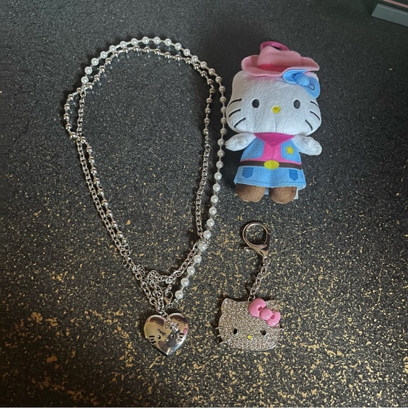 comes with the hello kitty cowgirl plush dangler, a hello kitty rhinestone keychain and a hello kitty necklace. all in good condition. selling everything together!
