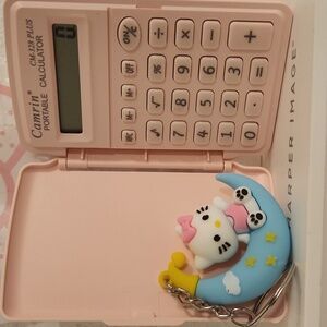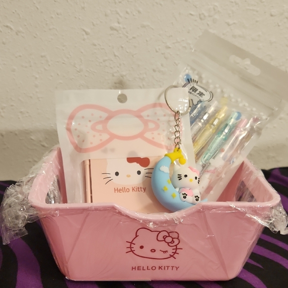 Small plastic tote, calculator, keychain, and pack of 6 new pens with various Sanrio characters on them as pictured. All new and ready for gifting :)