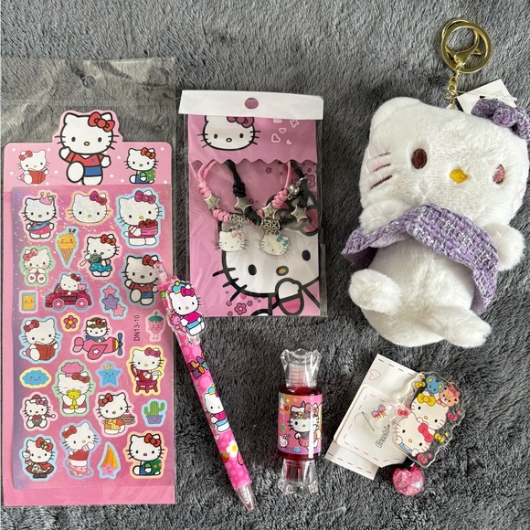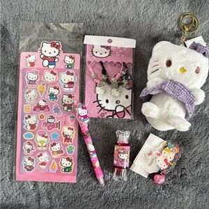 Hello Kitty bundle includes stickers, bracelets, plush charm/keychain, pen, hair ties and and lip tint