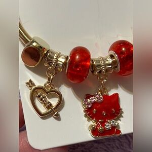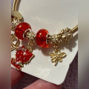 Hello Kitty charm bracelet features a gold-toned spring-style bangle adorned with a variety of festive and symbolic charms.