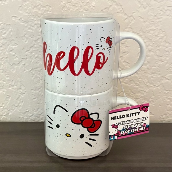 • Design: One mug features Hello Kitty's face, and the other has the word "hello" in a red script.