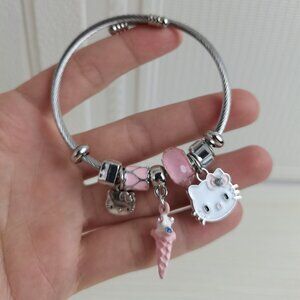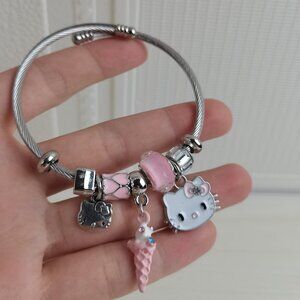 Hello Kitty Charm Pendant Silver & Pink Tone Bangle Bracelet
