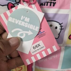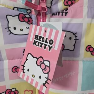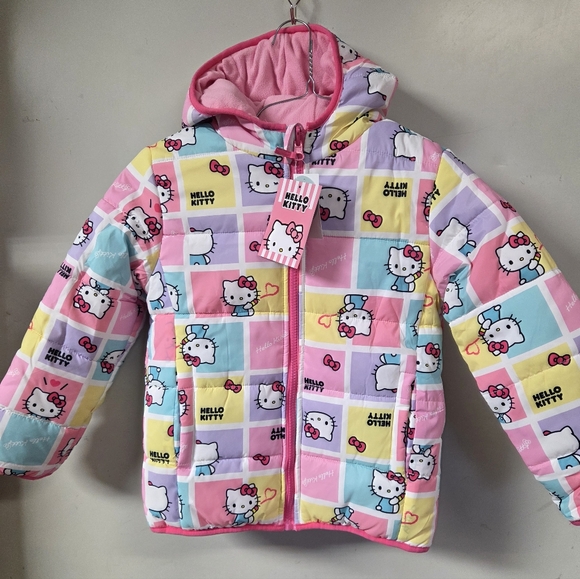 Vibrant Hello Kitty puffer jacket with a playful design. Features pink, yellow, blue, and white colors. Size 6/6x