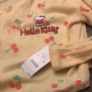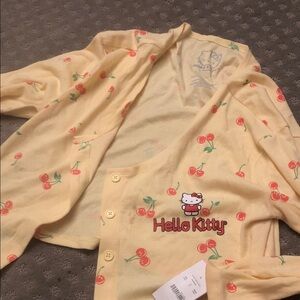 Charming cream cardigan with cherry pattern and Hello Kitty logo. Ideal for everyday style.