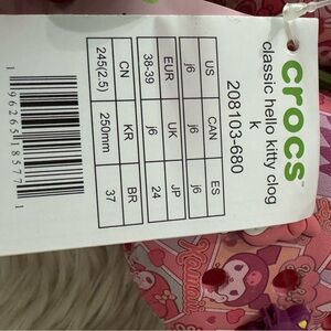 Hello Kitty crocs special edition, junior size but you could use afultas too, 6 J is equivalent to 7 us women and 5 J is equivalent to 6.5 women n