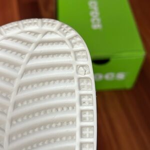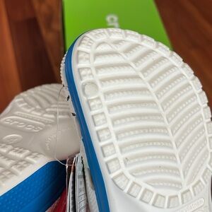 These CROCS sandals feature a vibrant red and white design, perfect for casual wear. The perforated white body ensures breathability, while the adjustable red strap offers a secure fit. A playful red bow adds a charming touch to these comfortable sandals. There’s an imperfection on each of the shoes soles shown in the last pic. This will fit women’s 6.