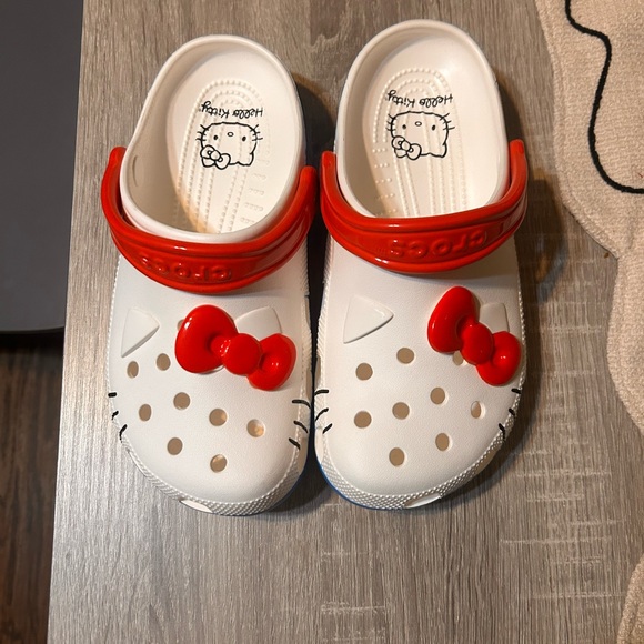 Adorable Hello Kitty Crocs with red bow detail. Perfect for casual wear.