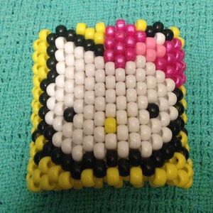 Large cuff made with pony beads Hello Kitty on the front and hearts and flowers on the back .